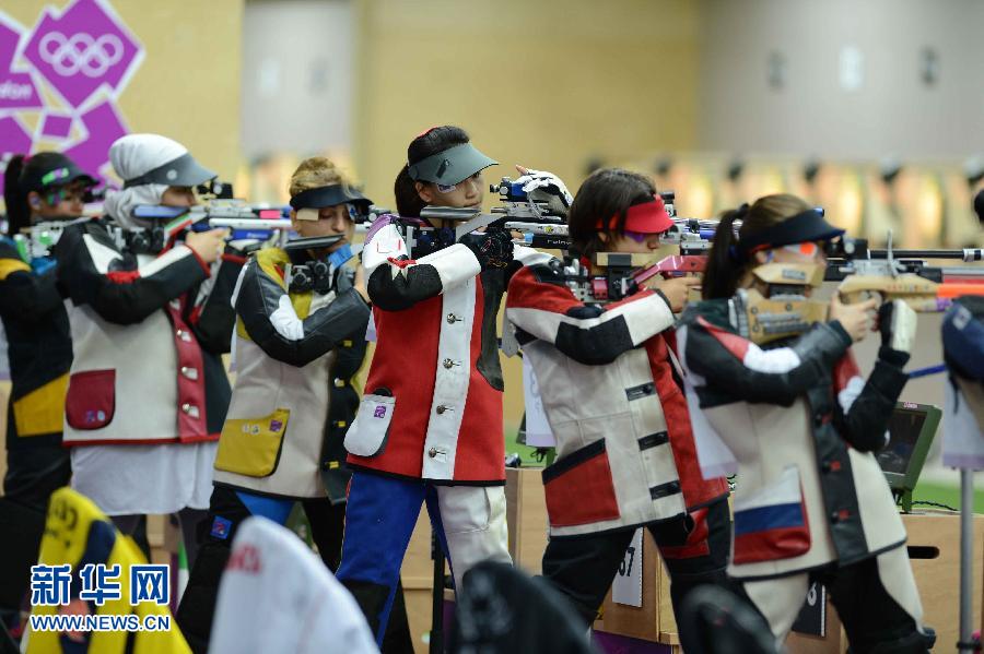 (中)在女子10米气步枪预赛中。当日,第30届夏季奥林匹克运动会首枚金牌将在伦敦皇家炮团兵营射击场女子10米气步枪项目中诞生,中国队派出易思玲、喻丹两名选手参加角逐。新华社记者杨磊摄
